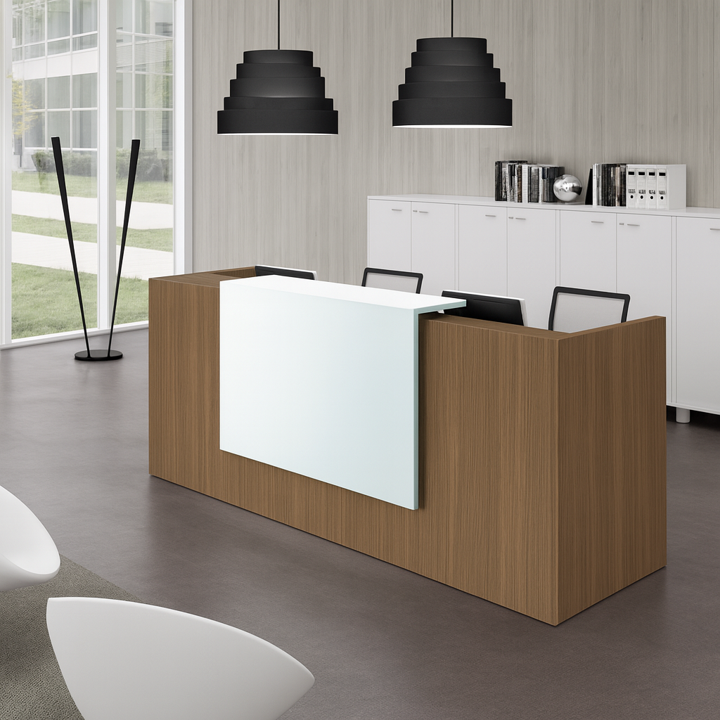 Ce comptoir d’accueil moderne associe élégance et praticité. Conçu en bois avec un panneau en verre dépoli, il offre une allure raffinée idéale pour les espaces professionnels tels que bureaux, showrooms, cliniques ou hôtels. Son design minimaliste s’intègre facilement à tout type d’intérieur, tout en apportant une touche contemporaine et accueillante.