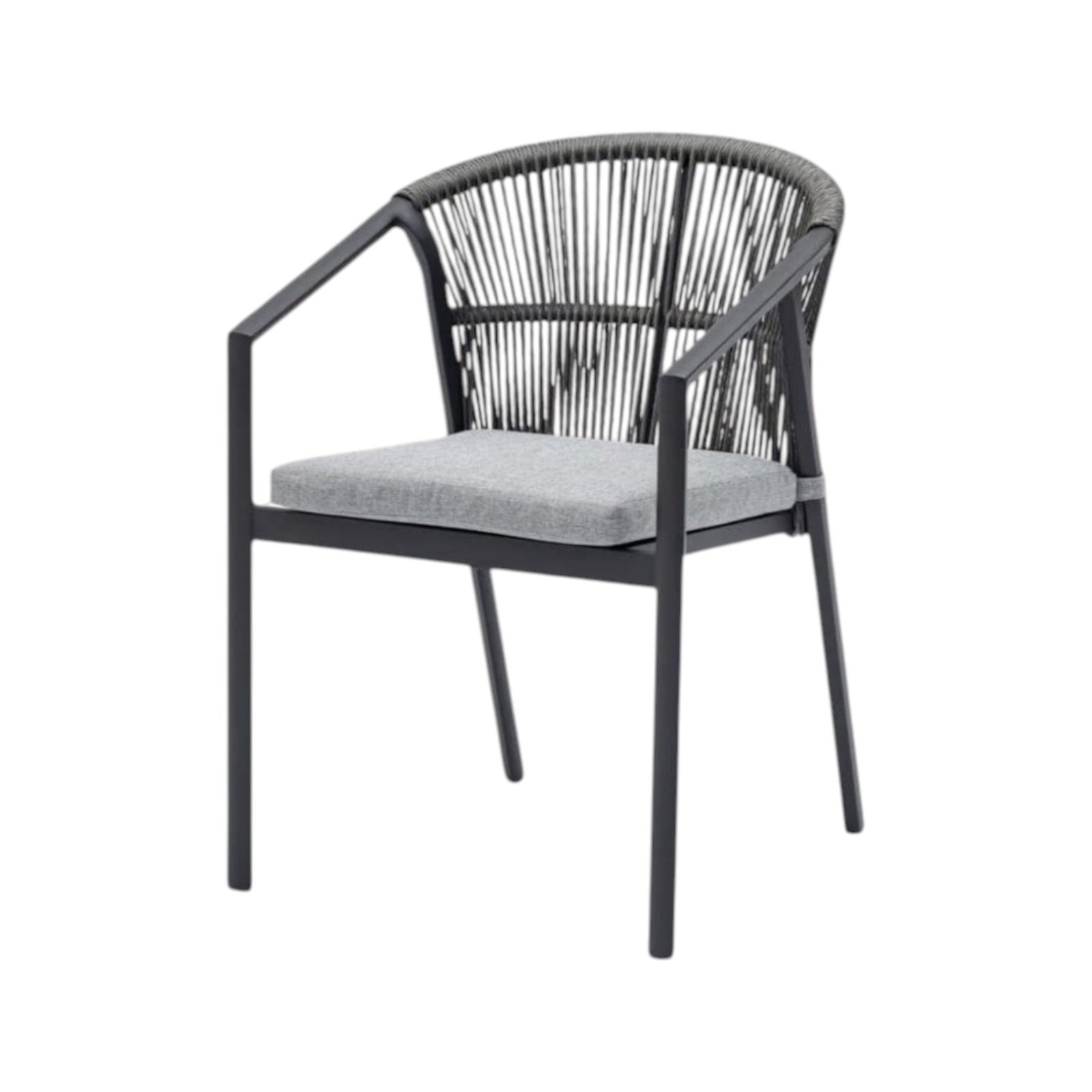 STRUCTURE EN ALUMINIUM PEINTE À POUDRE (POLYESTER). TRESSAGE DE CORDES IN TETORON (100% POLYESTER). COUSSIN ASSISE DÉHOUSSABLE AVEC TISSU HYDROFUGE OLEFIN (100% POLYPROPYLÈNE). EMPILABLE.