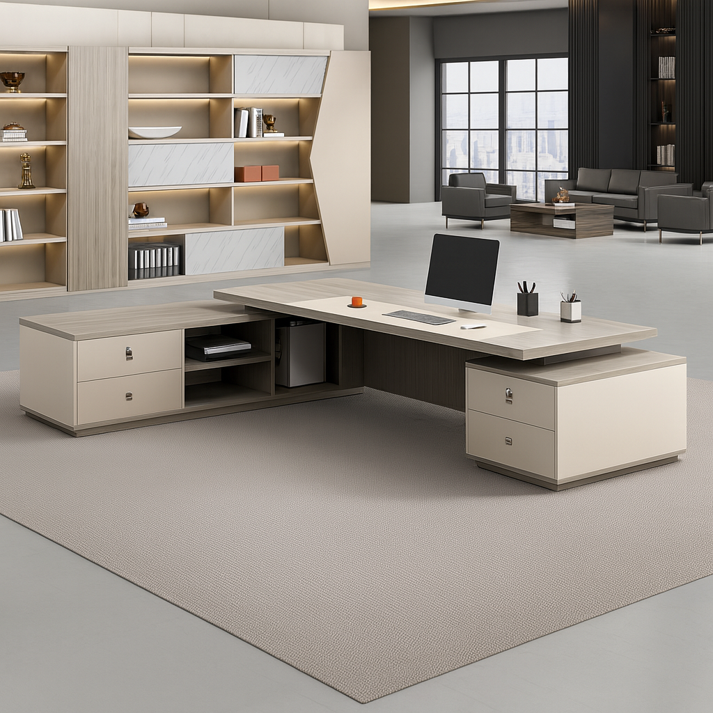 Le Bureau Exécutif Lumina se distingue par son design moderne et raffiné. Conçu en finition bois clair et beige, il offre une structure en L spacieuse avec des rangements intégrés pour une organisation optimale. Son style minimaliste et élégant s’adapte parfaitement aux espaces professionnels haut de gamme. Alliant esthétique, confort et praticité, ce bureau est l’allié idéal des dirigeants et managers exigeants.