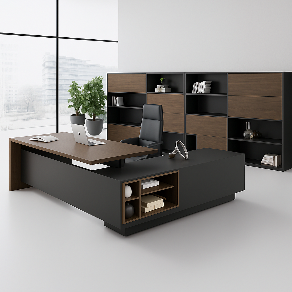 Le Bureau Exécutif Orion est la parfaite alliance entre élégance et modernité. Conçu en forme de L, il associe une finition bois foncé chaleureuse à une structure noire mate sophistiquée. Son large plateau offre un espace de travail spacieux, tandis que ses modules de rangement intégrés garantissent praticité et organisation. Idéal pour les dirigeants et managers à la recherche d’un bureau qui reflète prestige, confort et professionnalisme.