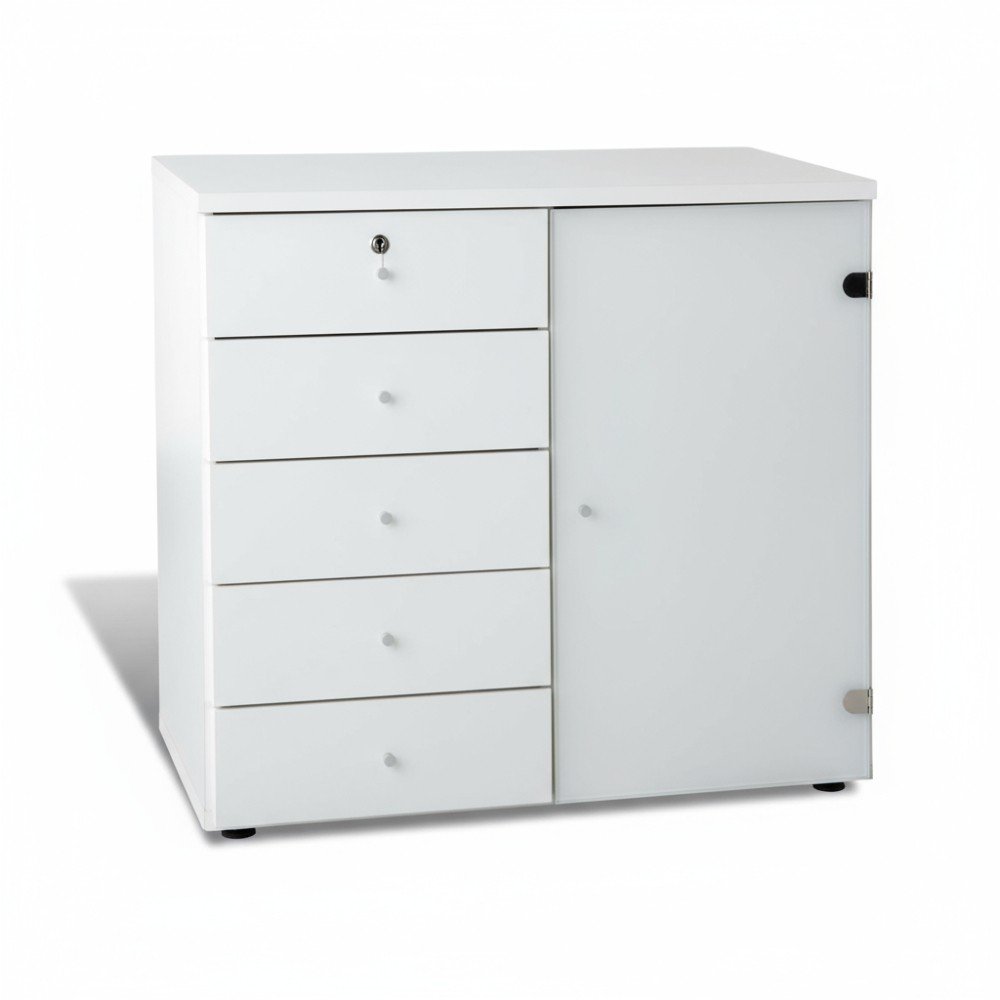 Dotée de plusieurs tiroirs spacieux et d’une porte latérale avec serrure, elle offre un espace optimal pour organiser vos documents, accessoires ou fournitures de bureau.